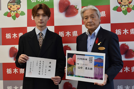 栃木県は21日、ダンスボーカルグループ「M!LK」メンバーで同県出身の山中柔太朗さん(左)を「とちぎ未来大使」に委嘱した。山中さんは「大使はずっとやりたかった仕事の一つ」と就任の喜びを語った=県庁 【時事通信社】
