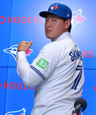 ブルージェイズの入団会見でポーズを取る岡本和真。カナダ・トロントの本拠地で記者会見し「その日、その日のベストを出してチームに貢献したい。世界一になりたくて(メジャーへ)来た」と抱負を述べた=6日 【時事通信社】