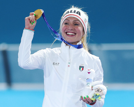 スピードスケート女子3000メートルで金メダルを獲得し、喜ぶイタリアのロロブリジダ=7日、ミラノ郊外 【時事通信社】
