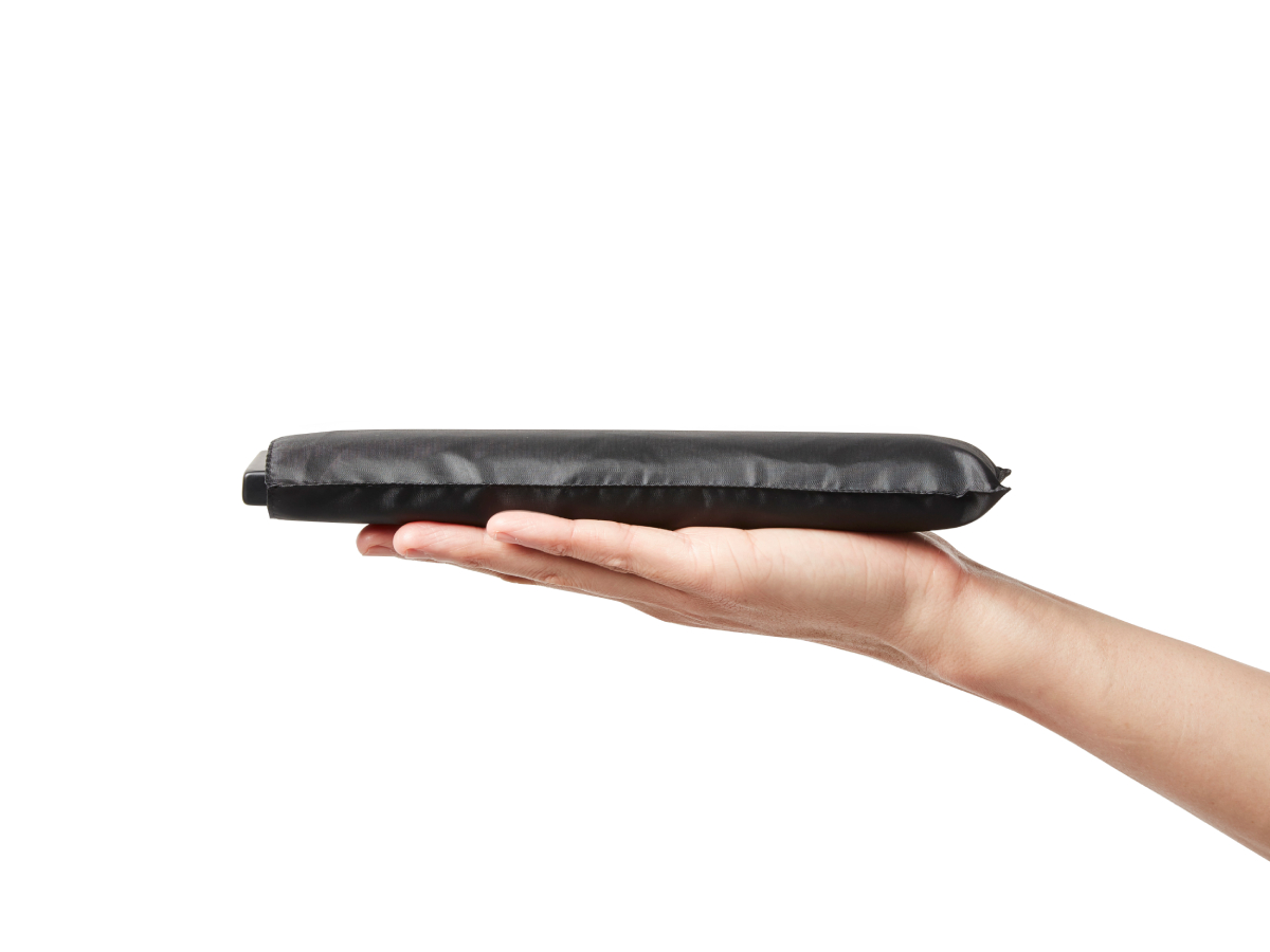 折り畳むと厚さ2.5センチに収まる「ポケフラット クイック」=自由が丘の傘専門店「ウォーターフロント」、折り畳み傘新商品