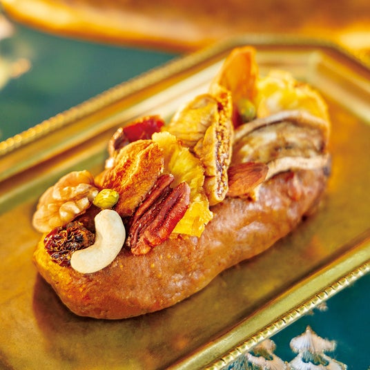 焼きあがったところに、白砂糖の代わりにカンボジアの椰子の花蕾から採れる「椰子の花蜜糖」をまぶして、12種類のドライフルーツやナッツをトッピングして出来上がり。ドライフルーツは、大きさや形が美しいものを厳選し、ピンセットで宝石を飾るように丁寧に並べています。