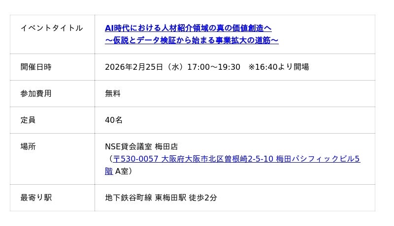 お申込みはこちら 人材ビジネス向けマッチングシステムを提供するポーターズ株式会社(東京証券取引所グロース.証券コード5126、東京都港区、代表 西森 康二)は、「AI時代における人材紹介領域の真の価値創造へ ~仮説とデータ検証から始まる事業拡大の道筋~ 」と題した無料オフラインイベントを2026年2月25日(水)17:00~大阪で開催します。