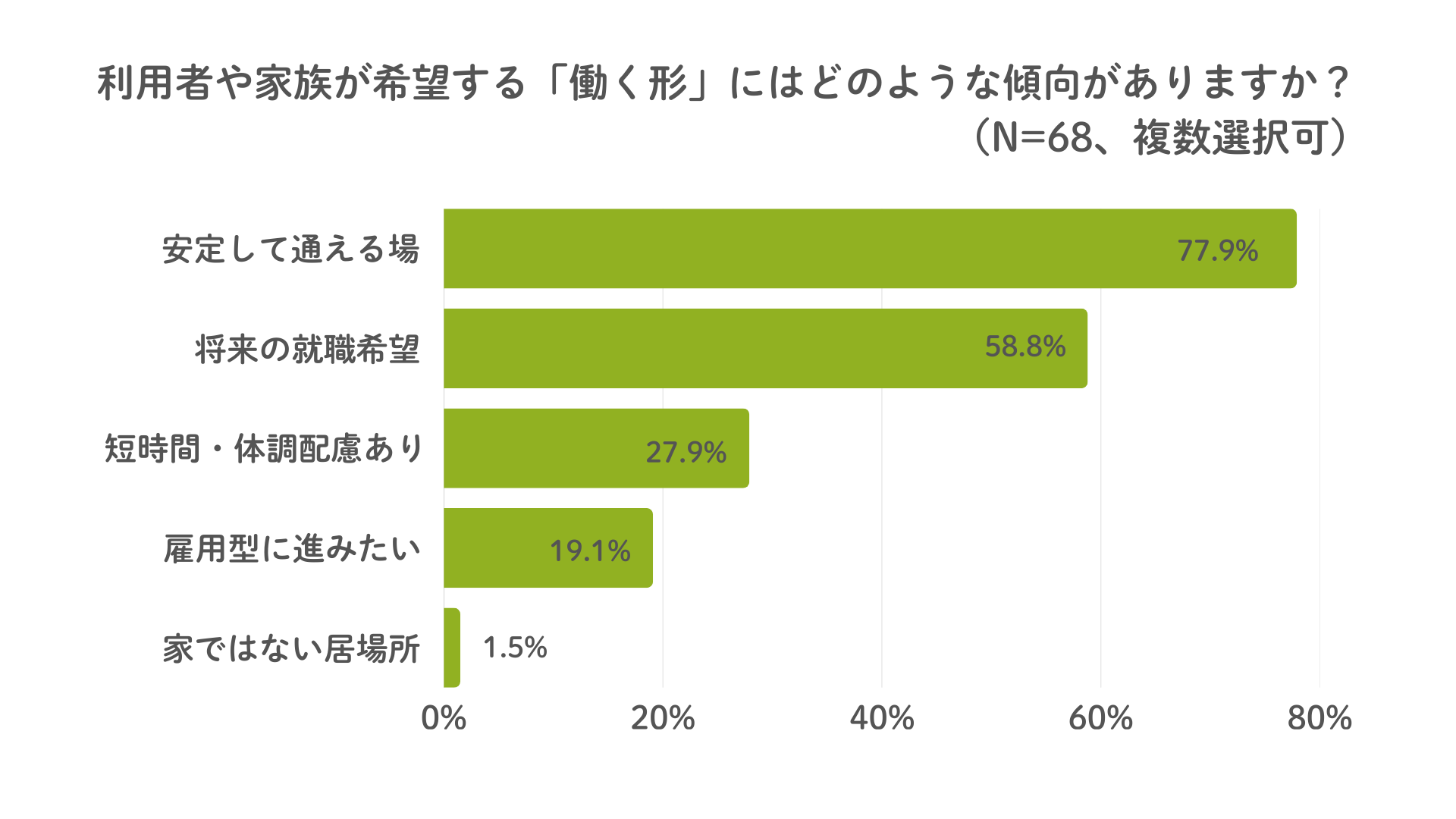 「利用者や家族が希望する「働く形」にはどのような傾向がありますか?(複数選択可)」という問いに対し、最も多かった回答は「安定して通える場(53事業所/77.9%)」でした。次いで「将来の就職希望(40事業所/58.8%)」と続きます。